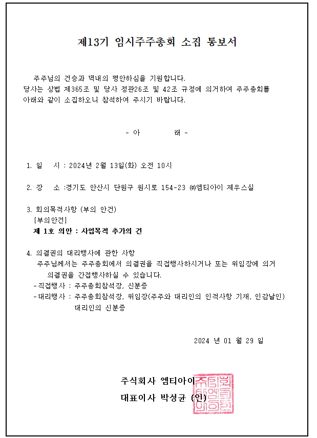 13기 임시주주총회를 아래와 같이 소집하오니 참석해 주시길 바랍니다.